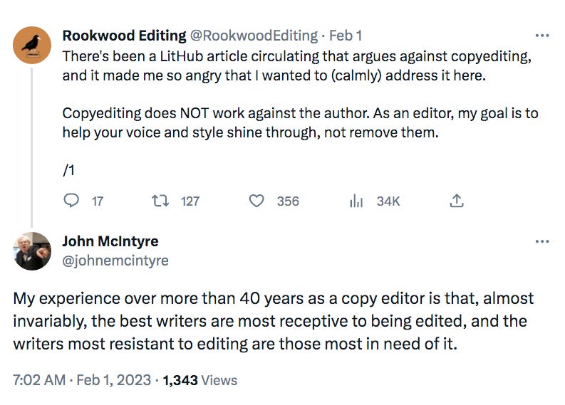 what copy editors dothey edit copy: they copyeditGeorge AthertonJul 11, 2023Sharefrom copy editor John McIntyre on Twitter (!?)*2023-07-11 / notes*a link; see the about page for how posts – and copies on fw – use linksfurther notes are often appended to copies on fwThanks for reading fewer wurdz. Subscribe for free. Unsubscribe anytime.Subscribe